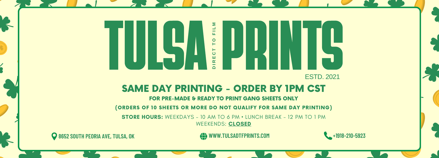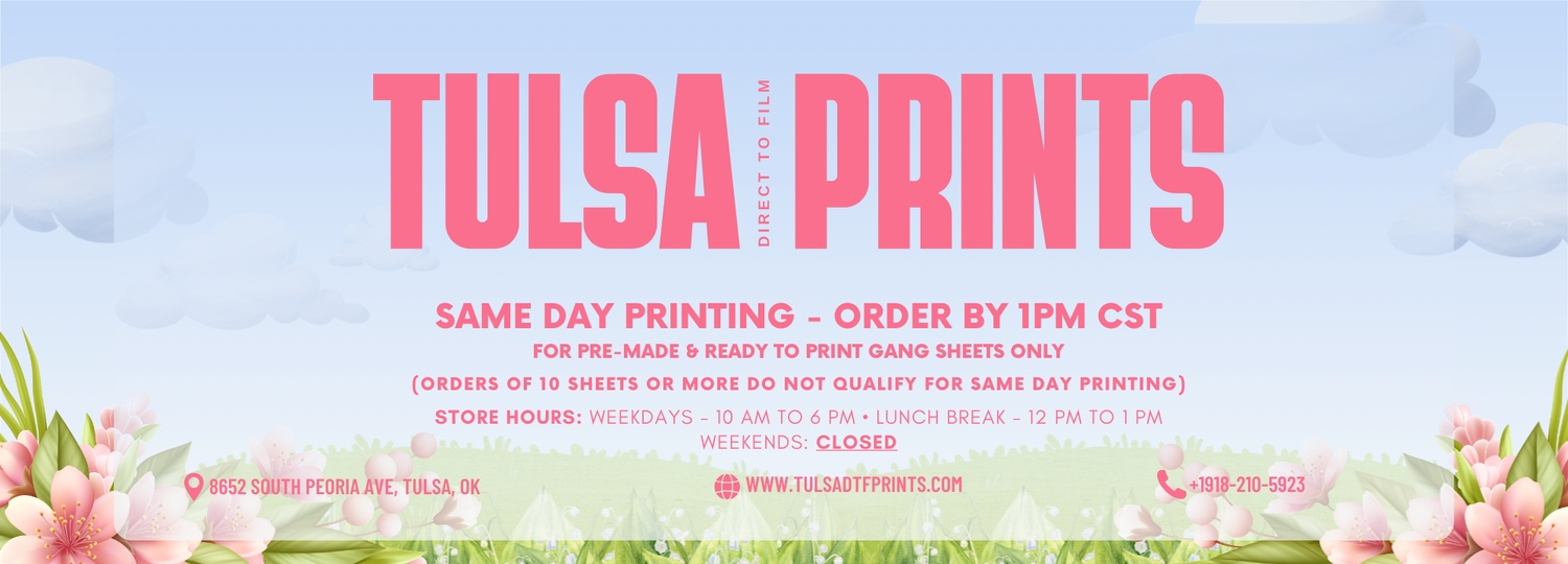 Do you have a question about your order, need help building your gang sheet or general inquiries about our services? Please email: Support@TulsaDTFPrints.com